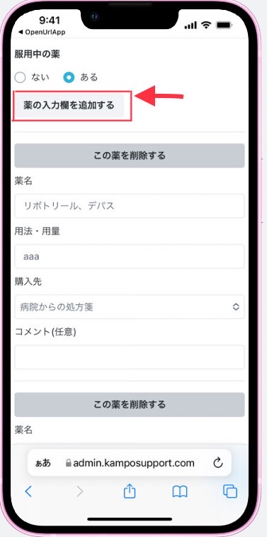 ・「薬の入力欄を追加する」をクリックすると入力欄が追加されます。