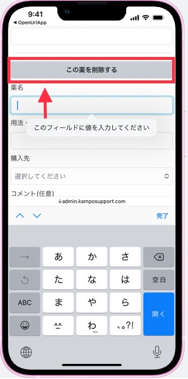 ・入力欄を削除したい場合が「この薬を削除する」のボタンをクリックいただき、保存ボタンを押すと正常に保存されます。